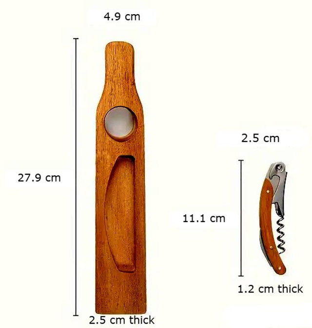 Acacia wood wine holder set. The set includes a waiter's knife with a corkscrew and a retractable foil knife, and also functions as a wine bottle holder. Long Live the Blues with this perfect gift for wine lovers. You can use this portable holder not only for wine bottles but also for your other favorite drinks. Just insert the bottleneck into the hole and slide it in and out to the balance point. This outstanding wooden holder can even hold half-empty bottles!