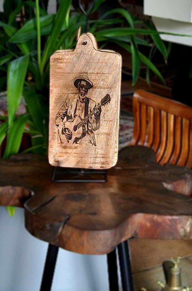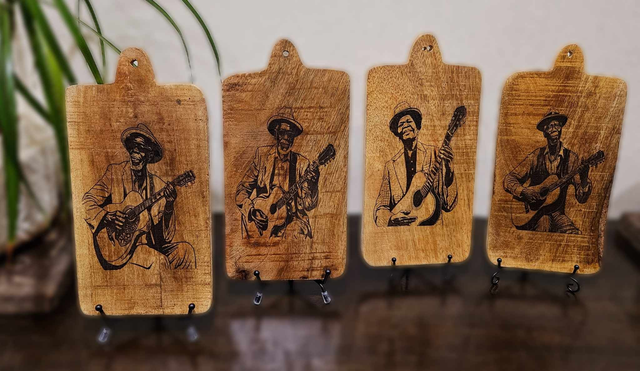 Get inspired with our stunning Blues appetizer boards! Are you looking for XL Blues coasters? Then these wooden base plates are definitely something for you. They are supplied with a holder so you can easily put them away. Made of rustic mango wood and engraved, they celebrate the blues with 4 diverse old time blues guitarists. This set consists of 4 coasters and a stand on which they can be hung.
