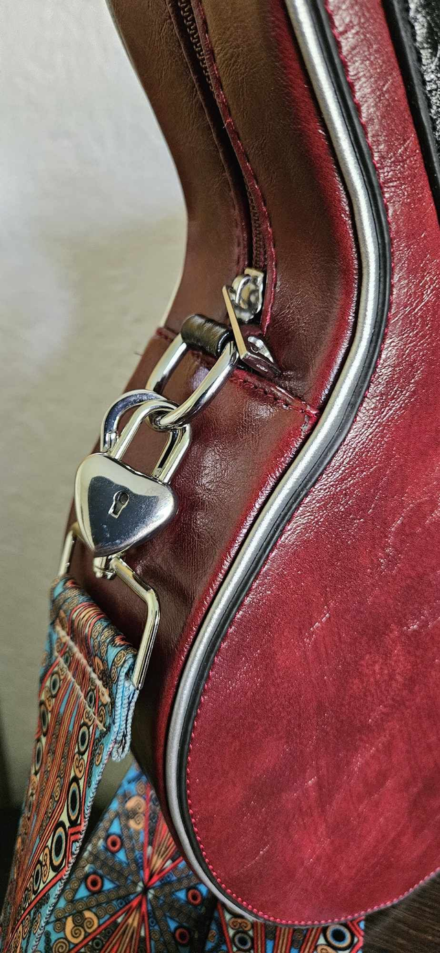 Elevate your fashion ensemble with this unique Vintage Guitar Concert Bag which has been intricately crafted from premium PU leather. Not only is it a functional accessory, but it also stands as a statement piece, promising to turn heads wherever you go. A perfect blend of style and substance, this bag is a testament to the timeless allure of Blues music. Inside and back side zipper pockets, removable tassel and bling heart key ring, An additional feature….a working heart shaped padlock that can lock the zipper while partying at a concert. Heart shaped padlock Included.